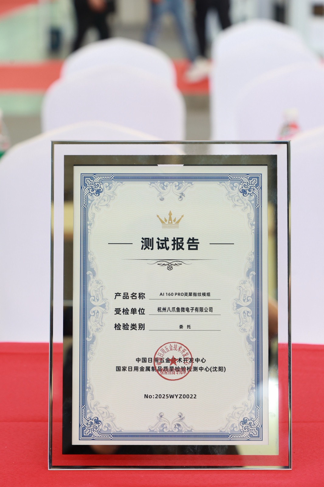 其中,八爪鱼微电子AI160-PRO灵犀指纹模组凭借卓越性能顺利通过检测,并在大会现场获颁权威认证。