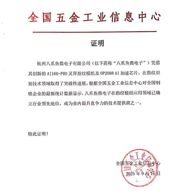 2025年10月10日,以“新起点 新标准 新征程”为主题的首届AI智能锁行业发展峰会在上海新国际博览中心隆重召开。本次会议由中国五金制品协会、中国五金制品协会制锁分会指导,北京奥维云网大数据科技股份有限公司联合中国日用五金技术开发中心与京东商城共同主办。峰会汇聚了来自智能门锁、安防、家电、AI芯片等多个领域的行业领军企业,共同探讨AI智能锁的技术发展方向与产业未来。AI的引入,为智能门锁行业注入了全新的创新动力,也推动了从“智能化”到“智慧化”的跃迁。 《AI智能锁》团体标准重磅发布,八爪鱼微电子深度参编作为本次峰会的核心亮点,《AI智能锁》团体标准在中国五金制品协会、中国日用五金技术开发中心、奥维云网、京东、八爪鱼微电子等企业的共同见证下正式发布。 在标准制定过程中,八爪鱼微电子作为重要参编单位,积极参与技术研讨与实践验证,分享了其在AI算法、芯片算力及模组集成方面的创新成果。公司基于AI算法加速与“感算一体(SAI)”架构的深厚积累,为标准的科学性、先进性与落地性提供了坚实支撑。中国五金制品协会专职副理事长柳润峰在大会现场为参编企业授牌,正式表彰八爪鱼微电子等企业对行业标准化发展的突出贡献。AI160-PRO灵犀模组通过权威检测,实力认证引领行业峰会期间,联合国家日用金属制品质量检验检测中心,依据《AI智能锁》团体标准,对申报产品进行了严格的技术检测与综合评估。其中,八爪鱼微电子AI160-PRO灵犀指纹模组凭借卓越性能顺利通过检测,并在大会现场获颁权威认证。作为八爪鱼微电子AI灵犀指纹品牌的核心产品之一,AI160-PRO以自研AI算法+高性能RISC-V加速芯片为双引擎,针对当前行业小面阵化趋势导致的识别率下降、特殊人群识别困难等痛点问题,提供了全新的解决方案。AI160-PRO采用八爪鱼专利DIXmatchᵀᴹ AI算法,结合生成对抗网络与图像扩展技术,可智能修复指纹缺失与模糊区域,综合识别准确率高达99.4%以上,特殊人群识别通过率提升超过82%。同时,模组在硬件层面通过创新的封装设计与ESD防护技术,进一步提升了在复杂环境下的稳定性与可靠性。自2019年成立以来,杭州八爪鱼微电子有限公司始终专注于“SoC+感算芯片+AI算法”的一体化研发路径,致力于打造“感算一体(SAI)”智能模组生态。此次AI160-PRO灵犀指纹模组的认证,不仅是对八爪鱼微电子技术实力的权威肯定,更标志着其在AI智能锁标准化进程中的关键角色。未来,八爪鱼微电子将继续以AI算法与芯片创新为驱动,携手行业伙伴,共同推动AI智能锁生态走向更高水平,为智能安防领域注入“中国芯”的新力量。