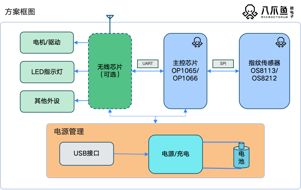 基于八爪鱼微电子OP系列主控芯片和OS系列按压式电容指纹传感器的小锁方案,拥有成熟稳定,系统精简,软件可定制,高性价比之选等特点,已量产方案总量市场占有率高达60%以上。该方案将原本的多芯片,高成本,低扩展,开发门槛高等问题做了逐一优化,仅使用八爪鱼微电子自研OP系列RISC-V主控芯片,运行指纹算法及逻辑控制,搭配80或100系列传感器,将研发门槛和物料成本的降低的同时,大幅缩减了PCBA的面积,为创新应用产品提供了更灵活地发挥空间。